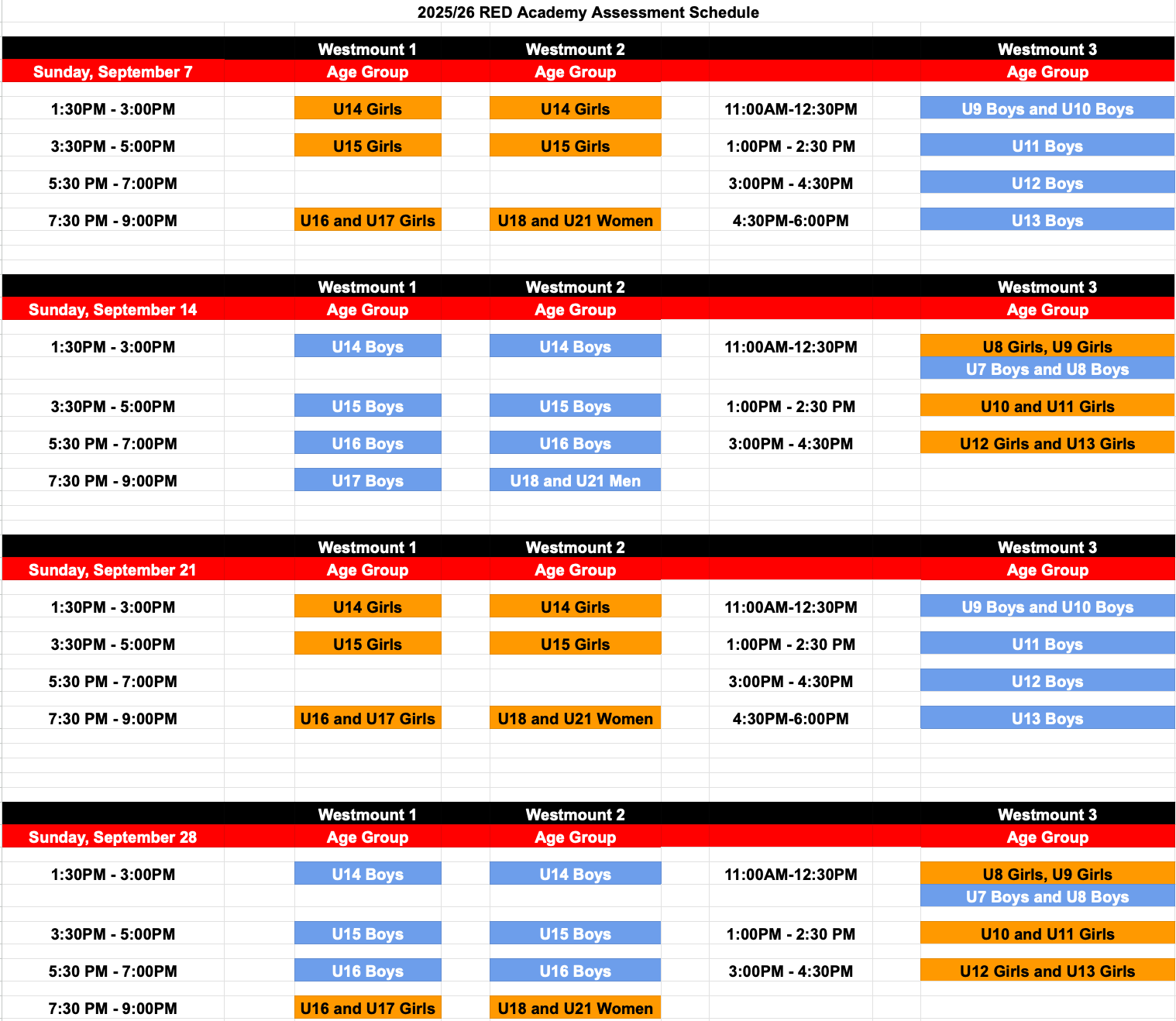 The full schedule can be viewed here. Boys sessions are highlighted in BLUE. Girls sessions are highlighted in ORANGE.